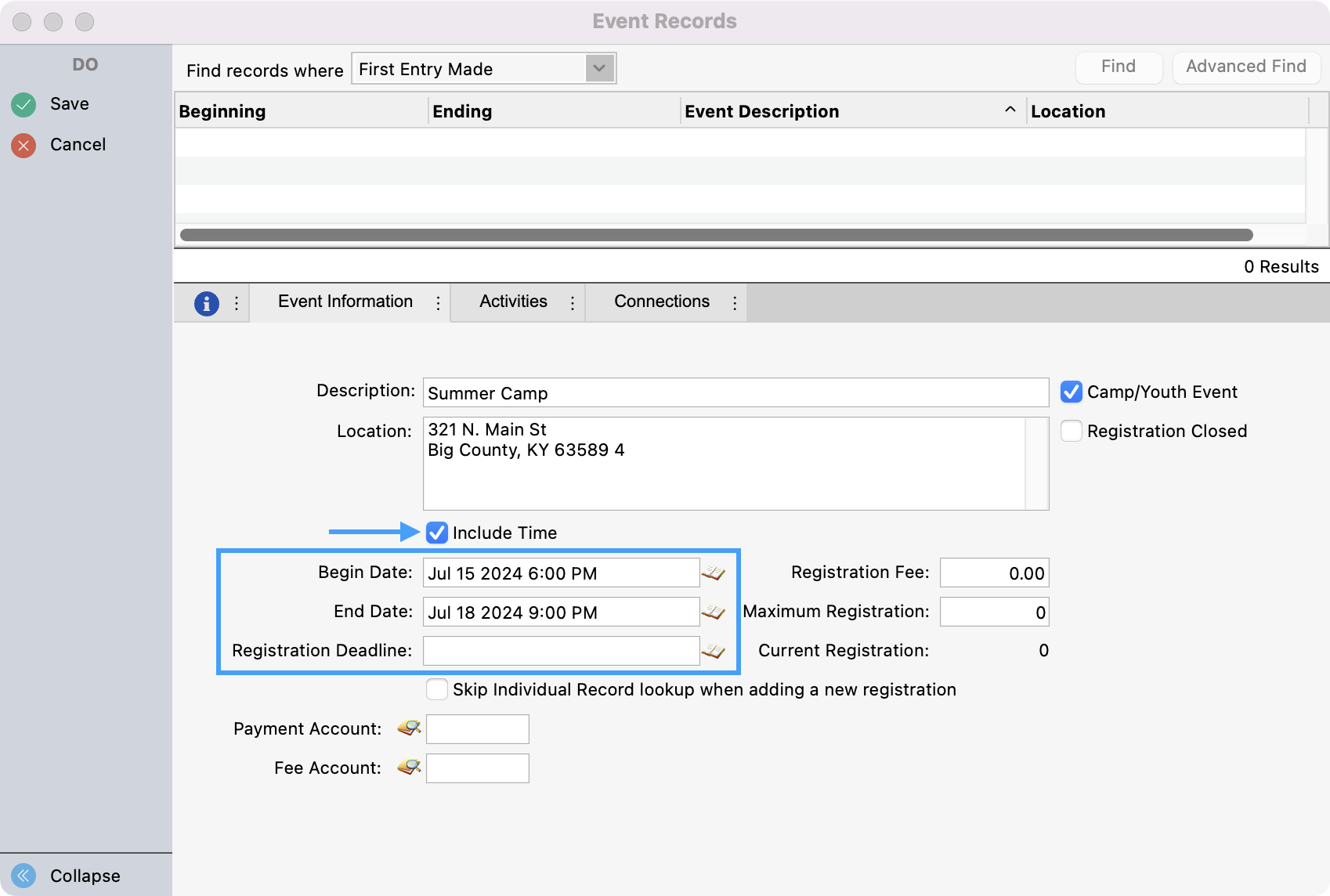 Enter the Begin, End, and Registration Deadline Dates. If you want to include times for your event, make sure to check the Include Time checkbox.