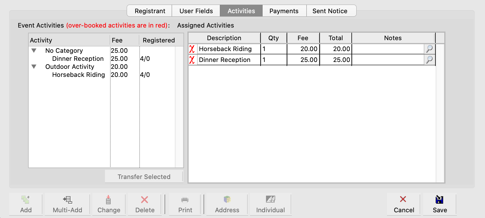 Either double-click an activity or highlight one or more activities in the Event Activities list on the left and click the small Transfer Selected button to register an event attendee for an activity. The activity will now appear in the Assigned Activities list on the right.