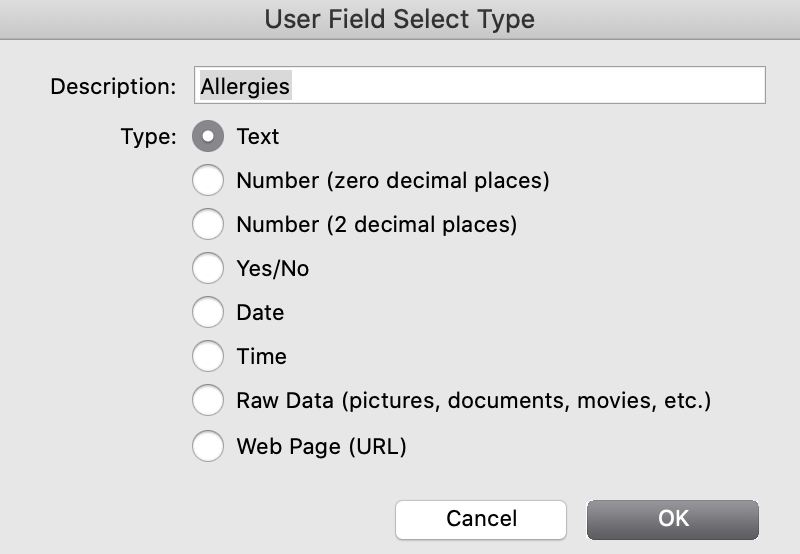 To add an item to the list, click the small Add User Field button at the bottom of the window. Place your cursor in the white box next to the down arrow and type the description of the code.