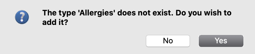 Type the Description of the other information type and select the appropriate radio button for the type of information this code will track. For example, if you need to record special Allergies of registrants, you would click Text. Click OK.