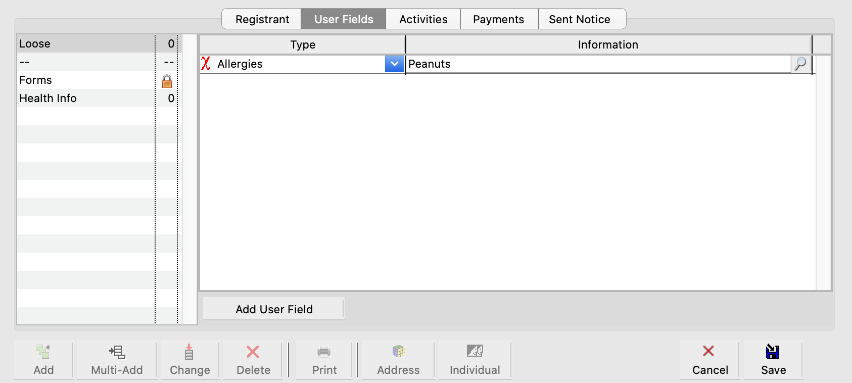 To add a user field, click the small Add User Field link at the bottom middle of the widow.