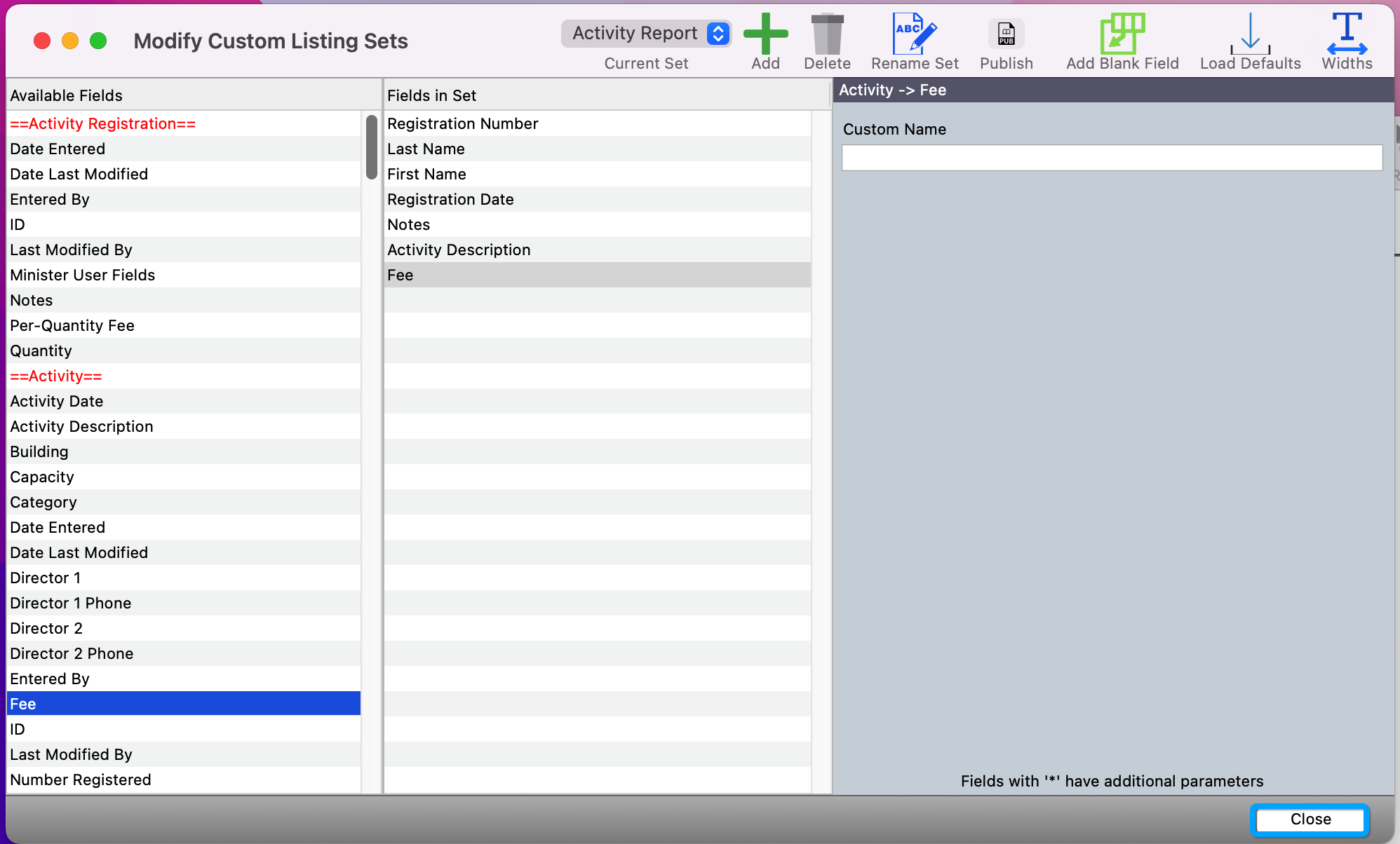 From here you can select which fields you would like to pull into the report. Below are a few recommendations. Once you have selected all the fields that you need, click on "Close."
