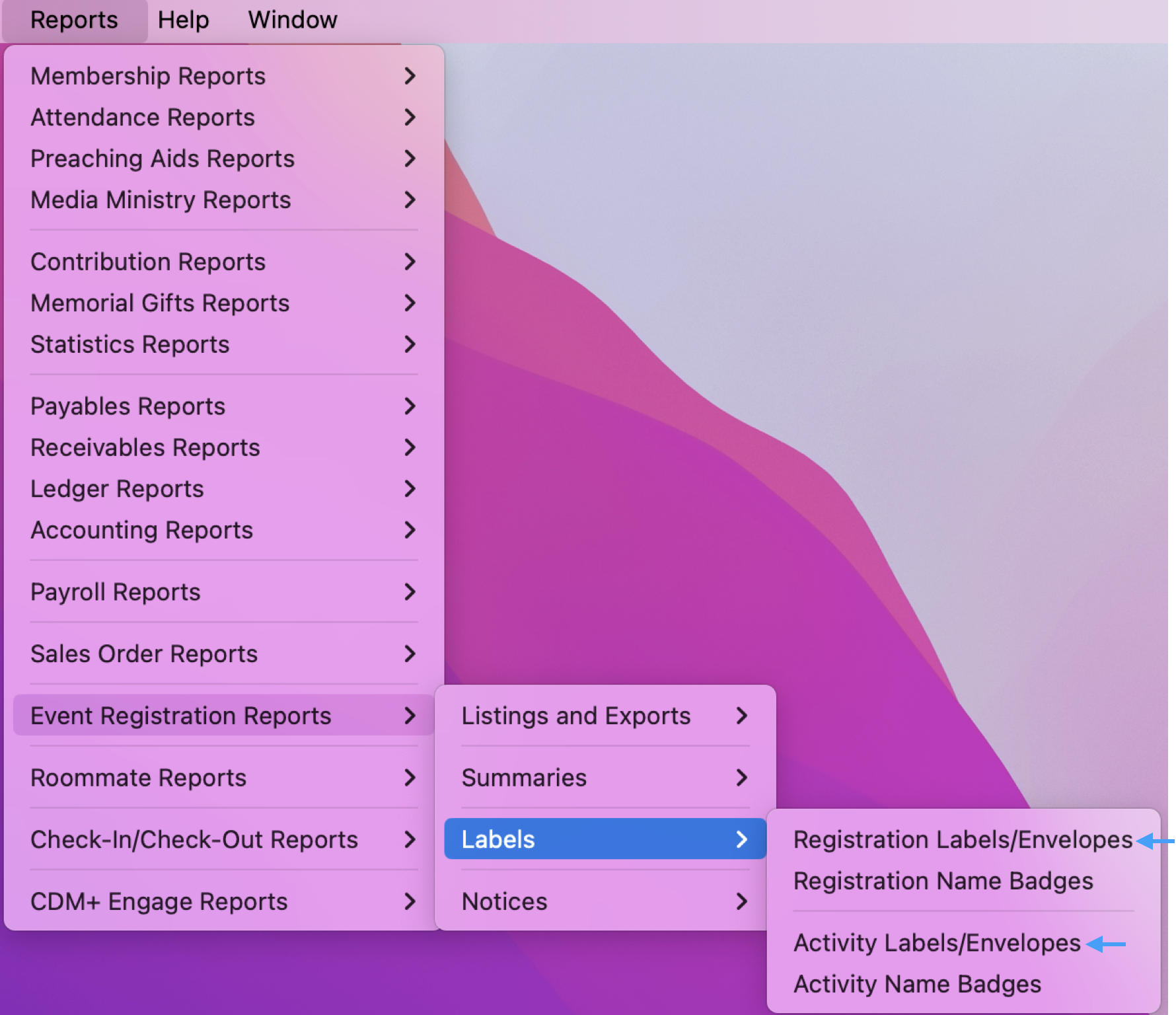 Then, click on the Reports tab → Labels → Registration Labels/Envelopes or Activity Labels/Envelopes