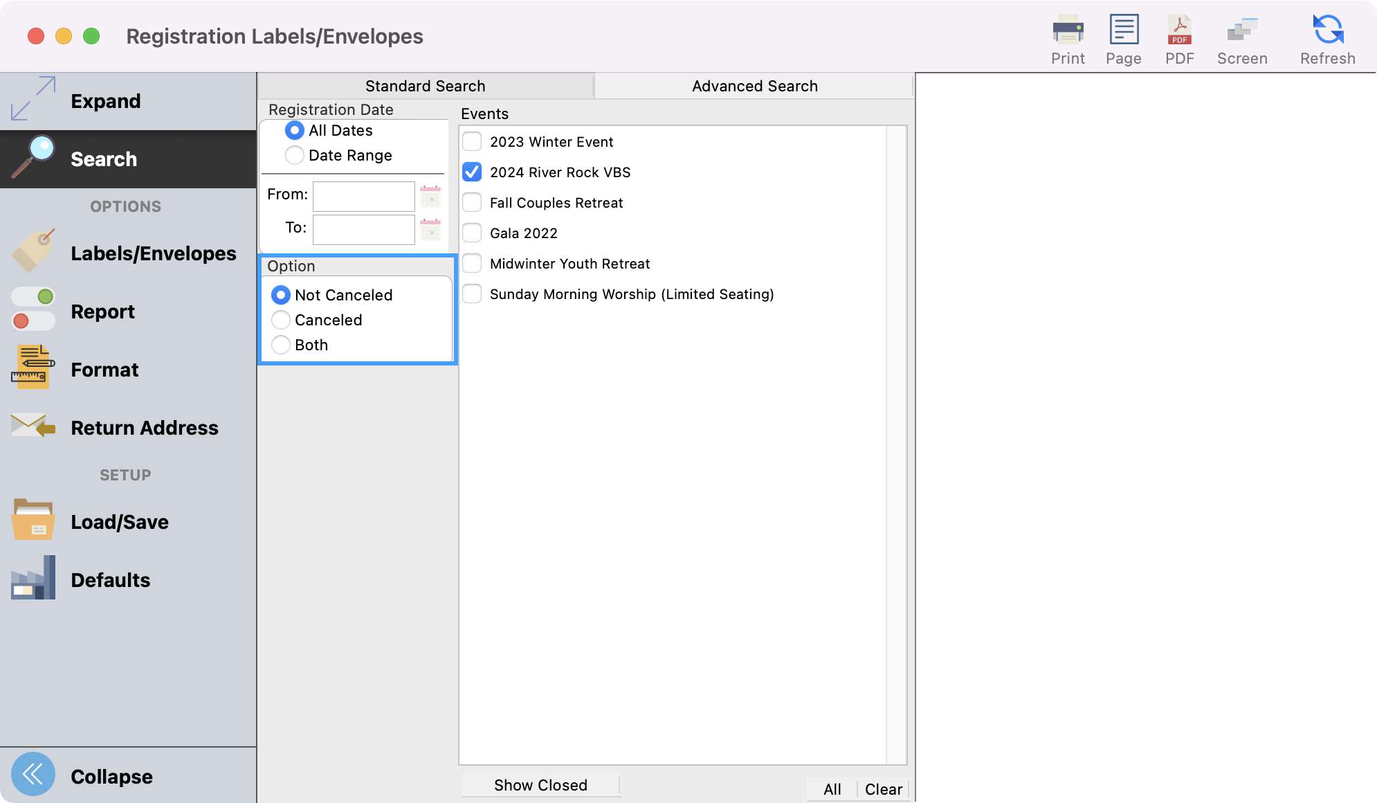 Under the Option heading, you can choose to print labels/envelopes for persons whose registration is Not Cancelled, Cancelled, or Both.