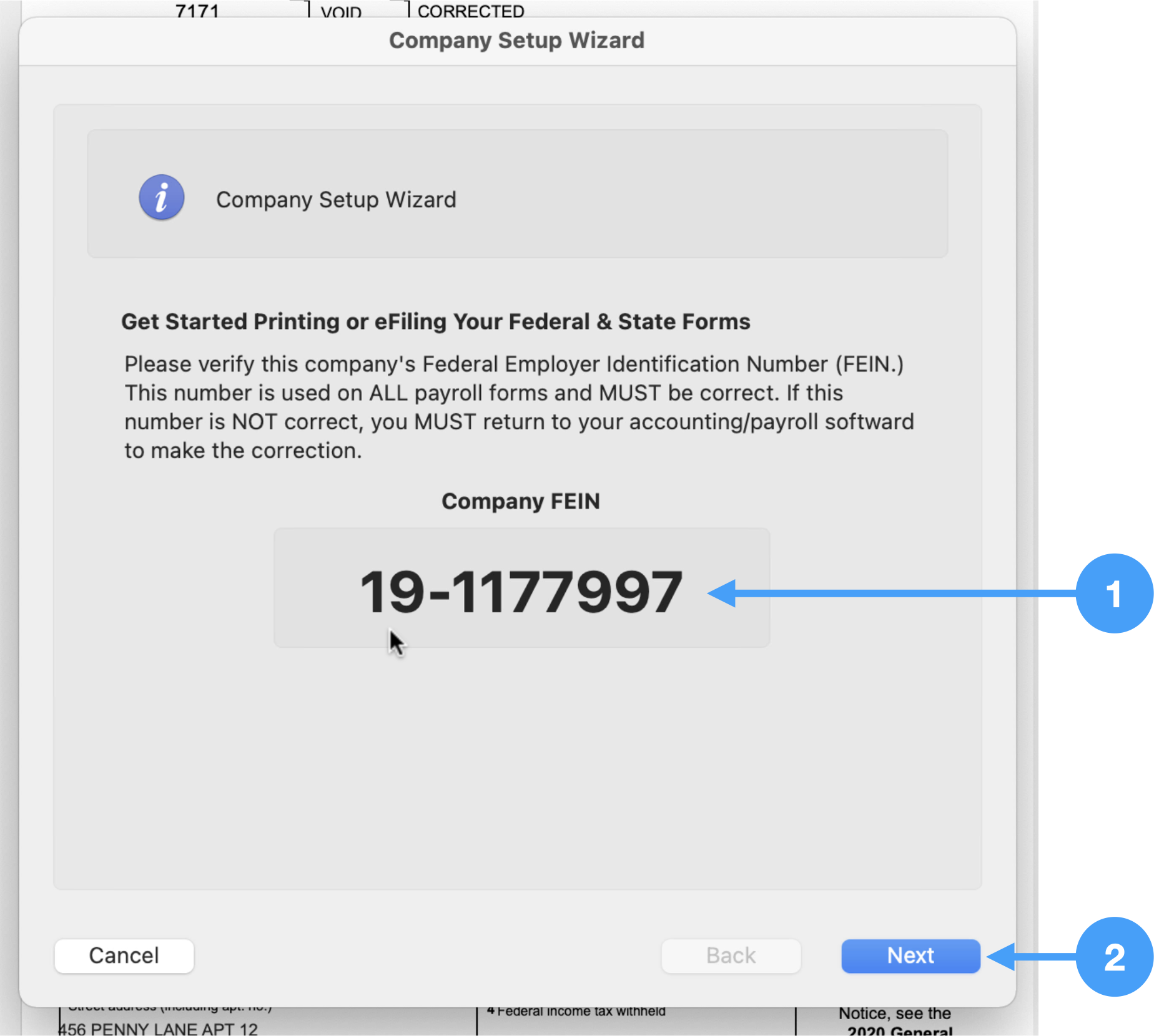 - Review the FEIN number. If it is incorrect, the cancel the wizard and go back into CDM+ Payer Records window to correct.