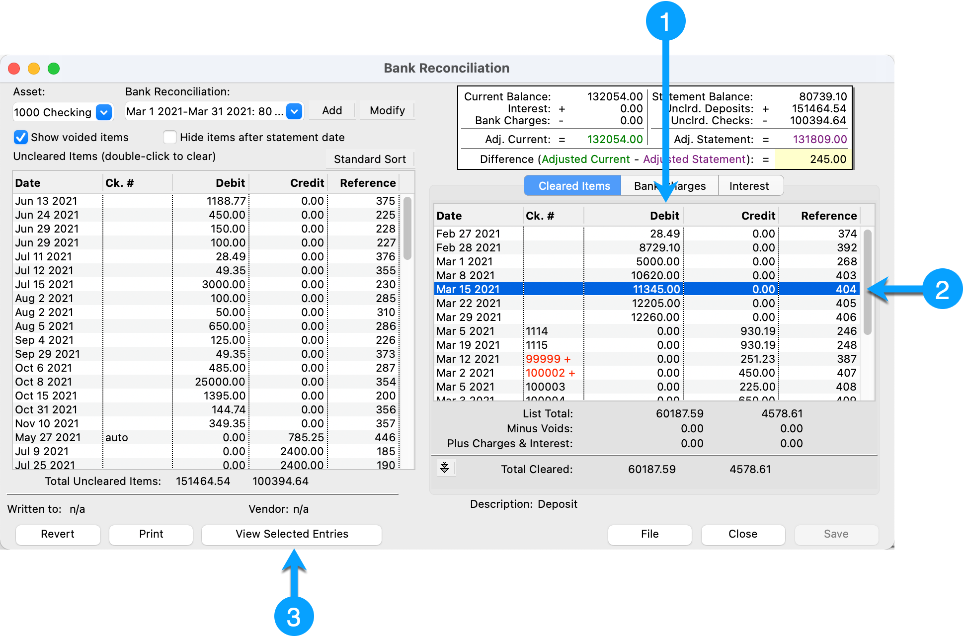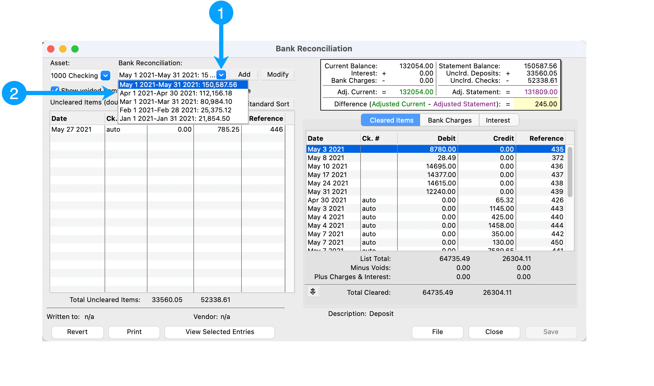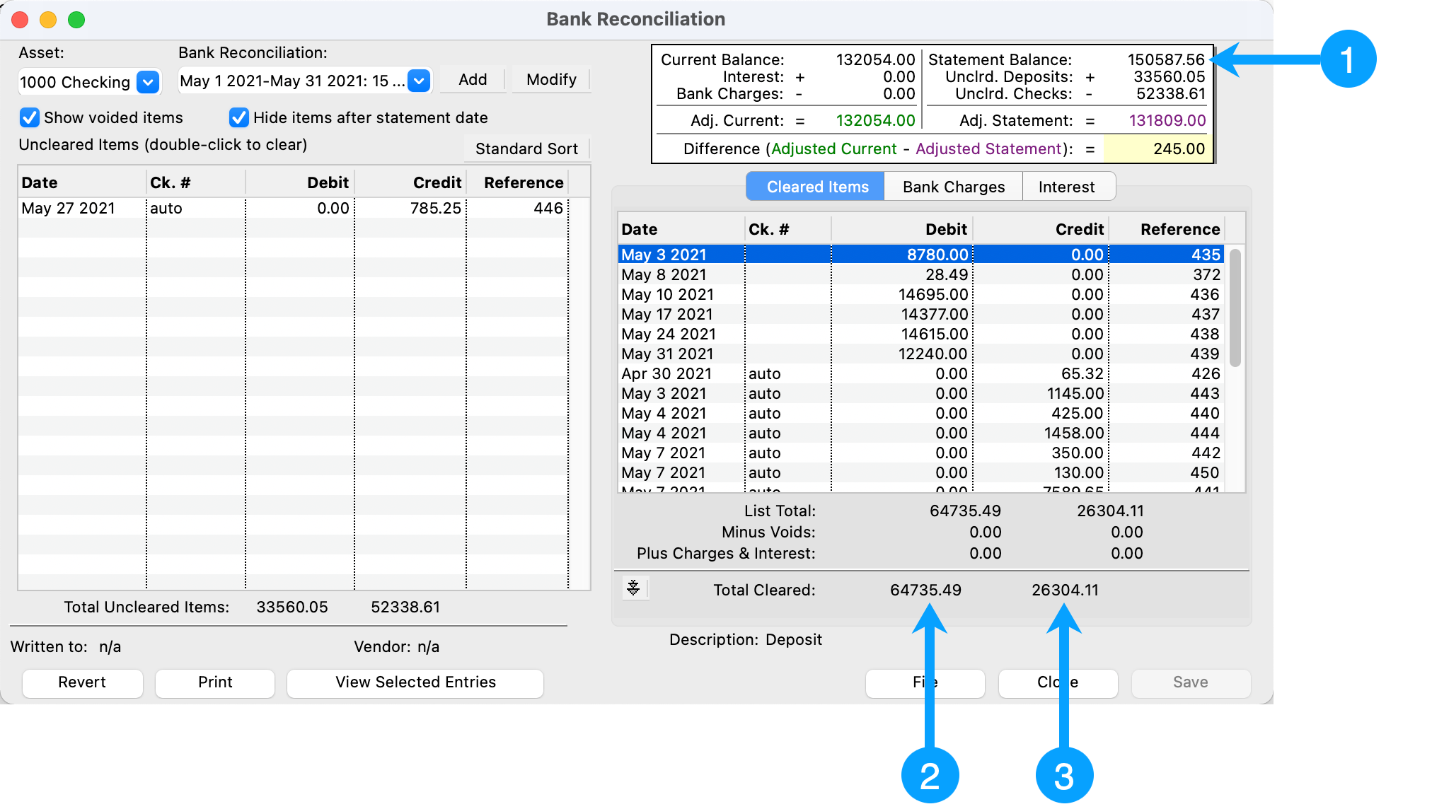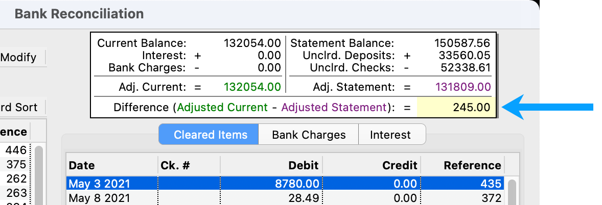 If any of these items are different from the bank statement, then you will need to either enter the correct Statement Balance and/or identify why there is a difference in the total cleared debits/credits.