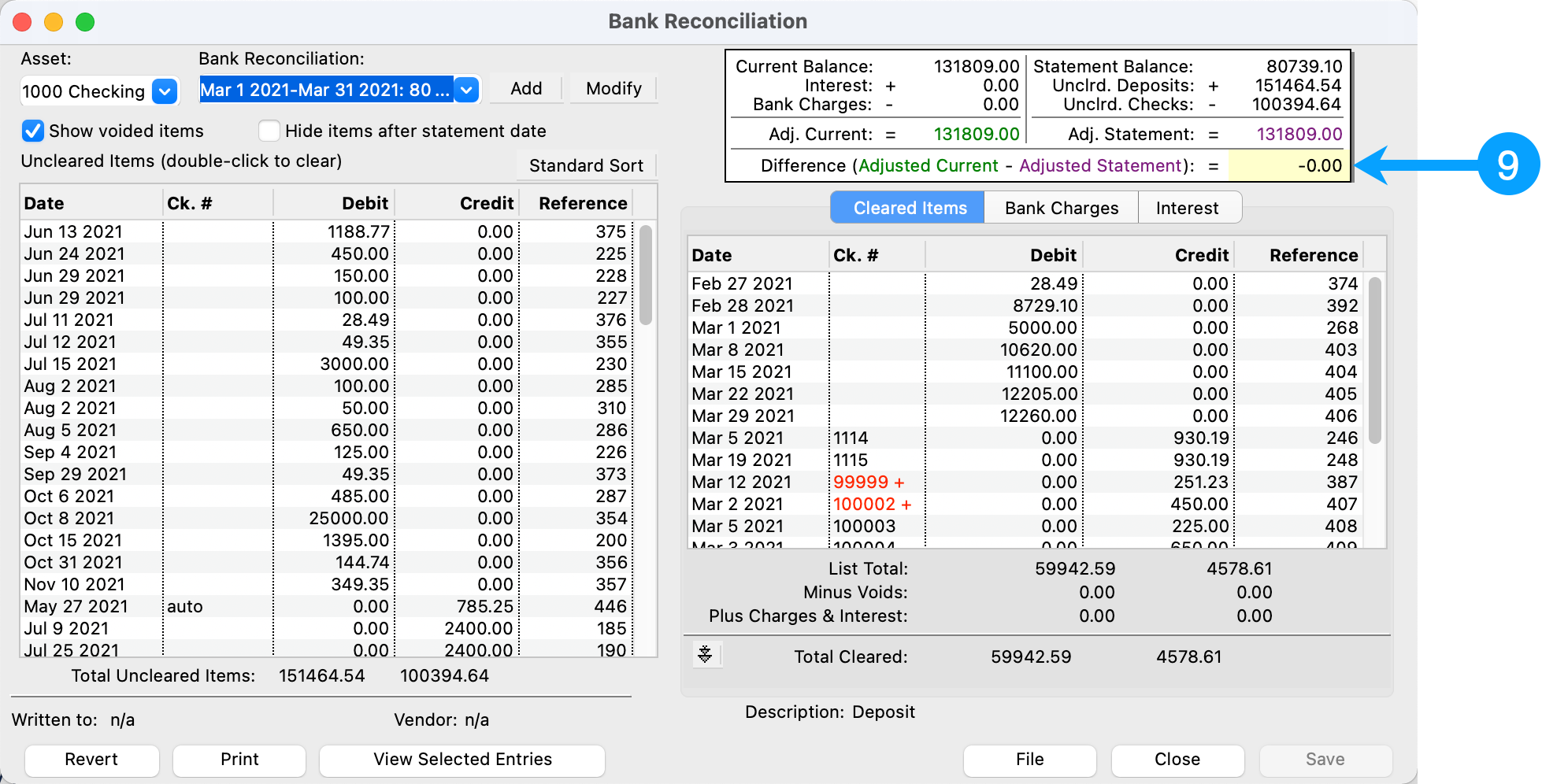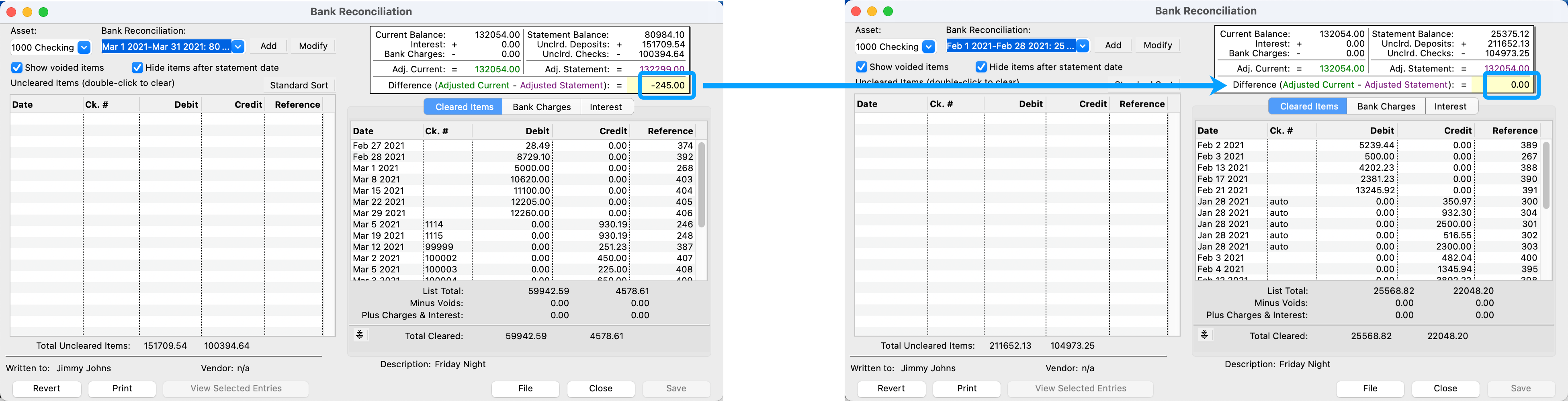 Go to the March bank reconciliation. The difference is now 0.00.