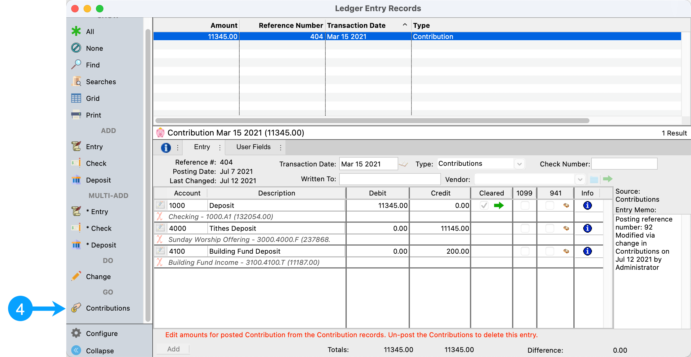 We review the debit amounts using prior contribution batch postings and discover that the March 15th batch is higher than what we have on our contribution posting report by 245.00.
