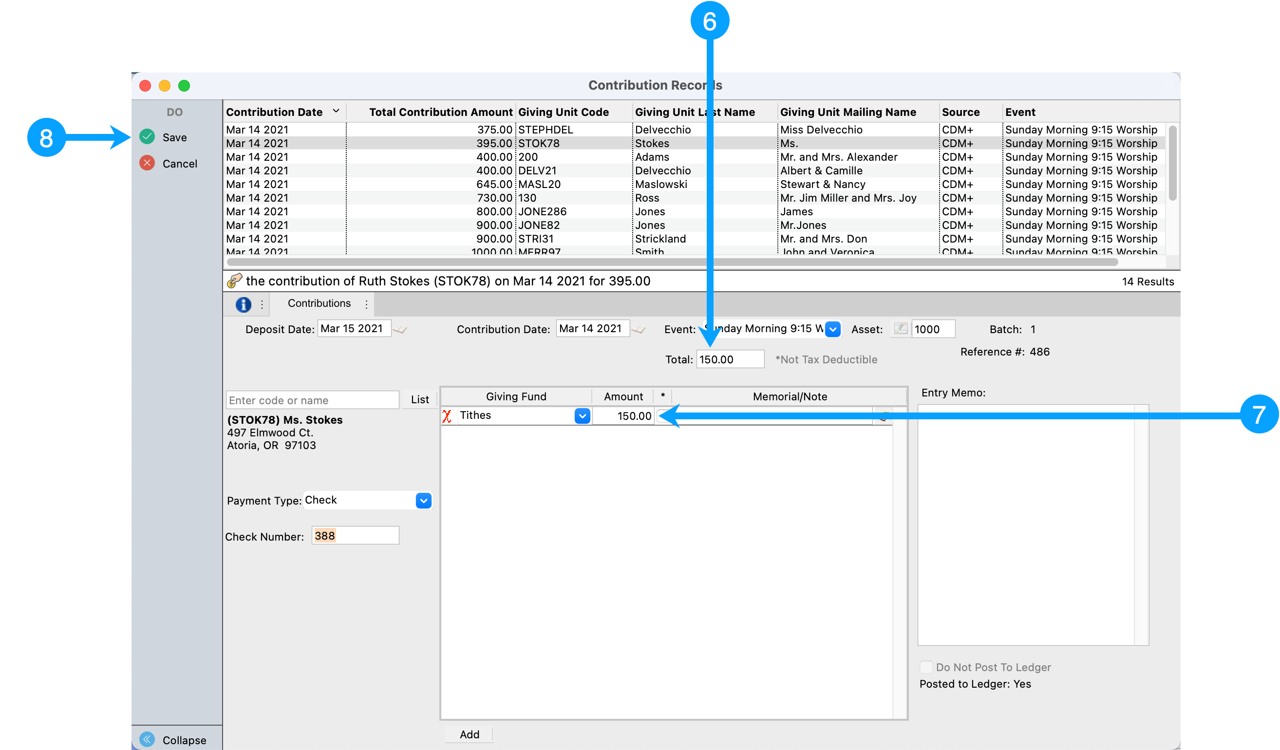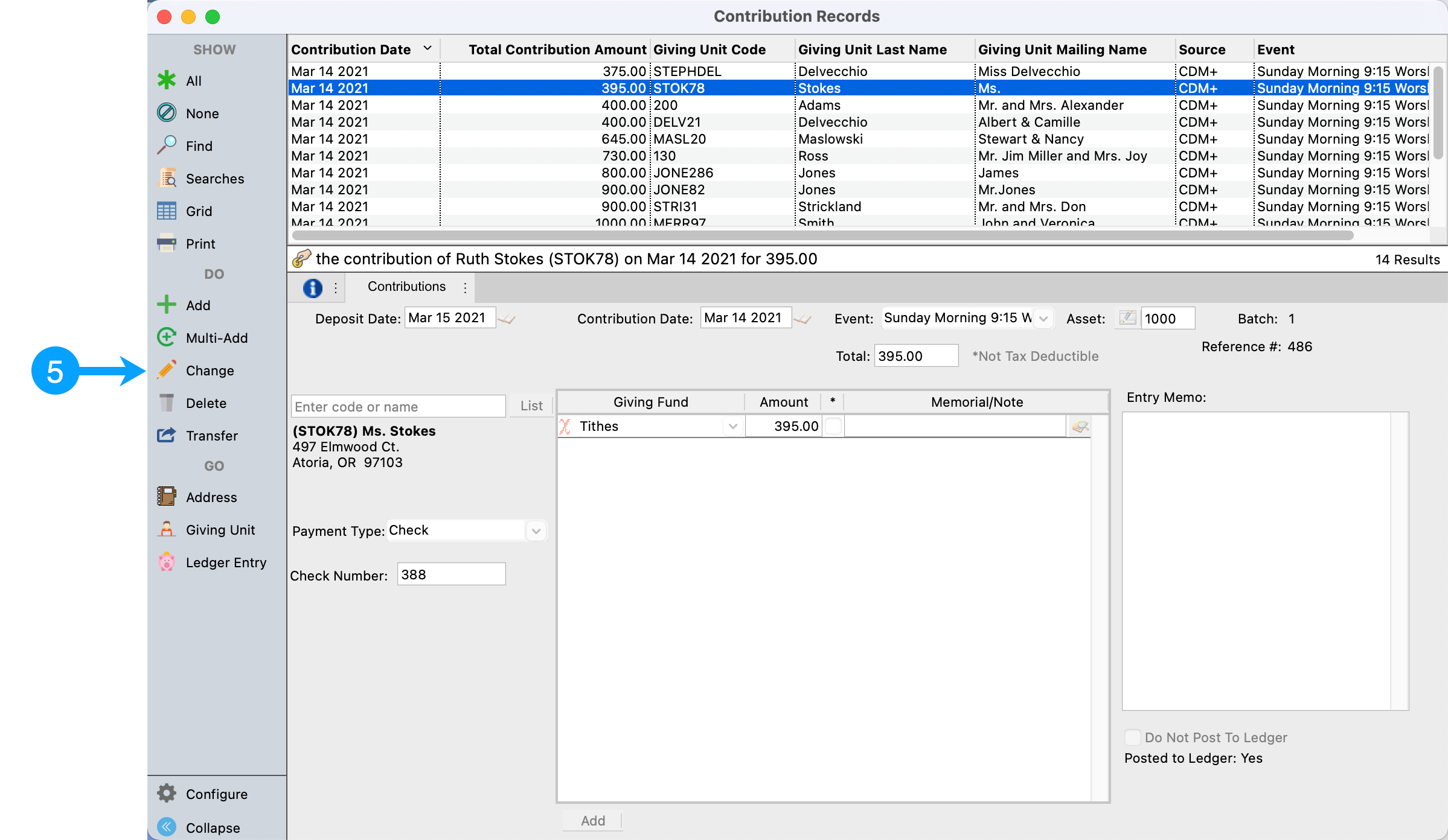 - Review all of the contribution records for this batch and identify the incorrect record(s). In our example, Ruth Stokes' contribution is 245.00 higher than what is on the contribution posting report (originally it was 150.00).Click Change