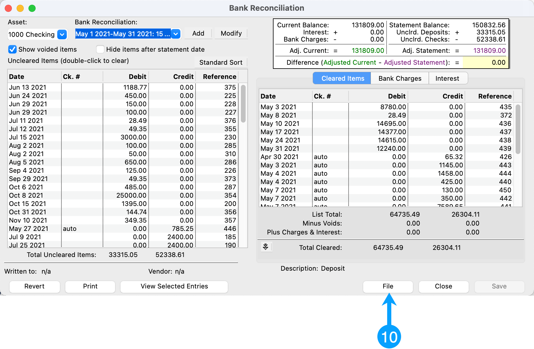 Go to the May reconciliation. It also has a difference of 0.00. You can now file your May bank reconciliation by clicking File.