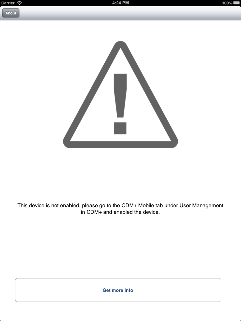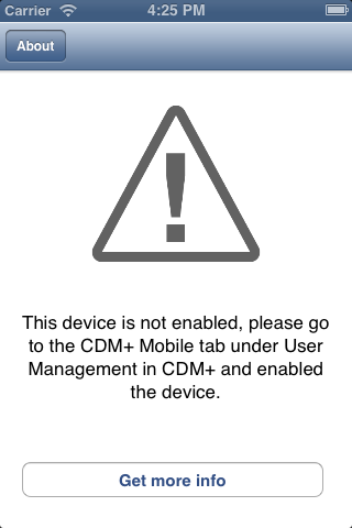 CDM+ Mobile will display an error screen stating the "device is not enabled" if the device it is running on has a valid provisioning code but is not enabled. To fix this error, the system administrator needs to go to the CDM+ Mobile tab under User Management in CDM+, find the provisioned device and slide the "Enabled" switch to ON. The mobile device that was experiencing this error must then back out of CDM+ Mobile and then re-enter. If this does not fix the problem, check to make sure the correct device in the device list in CDM+ was selected when the switch was changed. If the correct device was selected and it did not work, contact support.