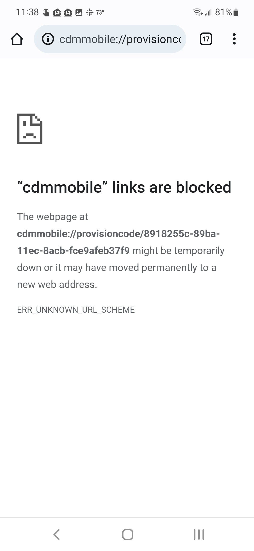 When attempting to provision an Android phone, you get the error, "'cdmmobile' links are blocked".