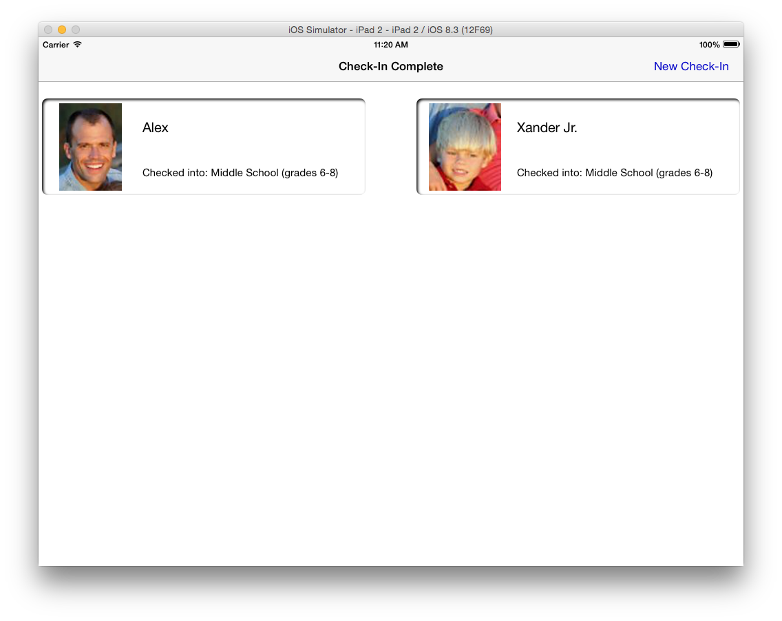 This screen displays the family members who have been checked in and also indicates whether there are badges to pick up for any of the persons checked in. After a moment, the Welcome to Check-In screen reappears automatically so that the next family can begin check-in.