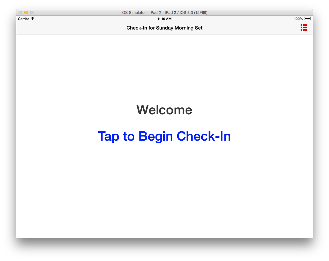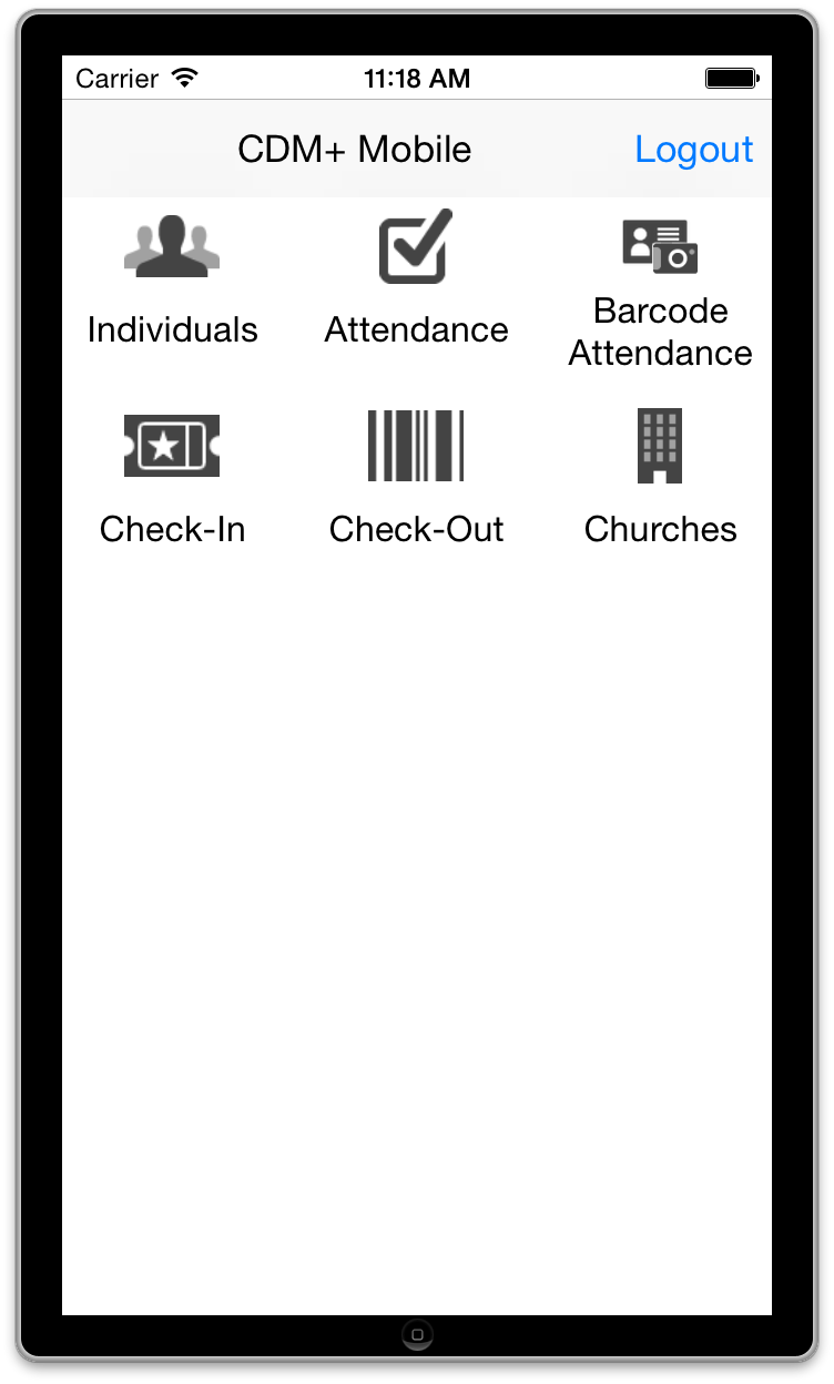 Log into CDM+ Mobile. If the Launcher for your available CDM+ Mobile features comes up, tap the Check-In icon. If an Individuals, Attendance, or Check-Out screen is displayed, tap the Launcher icon at the top right of the screen to return to the Launcher screen.
