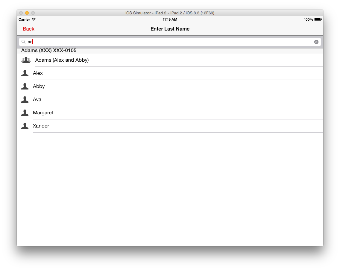 Tap the Tap to Begin Check-In link. The Enter Last Name screen appears with the cursor in a search field.