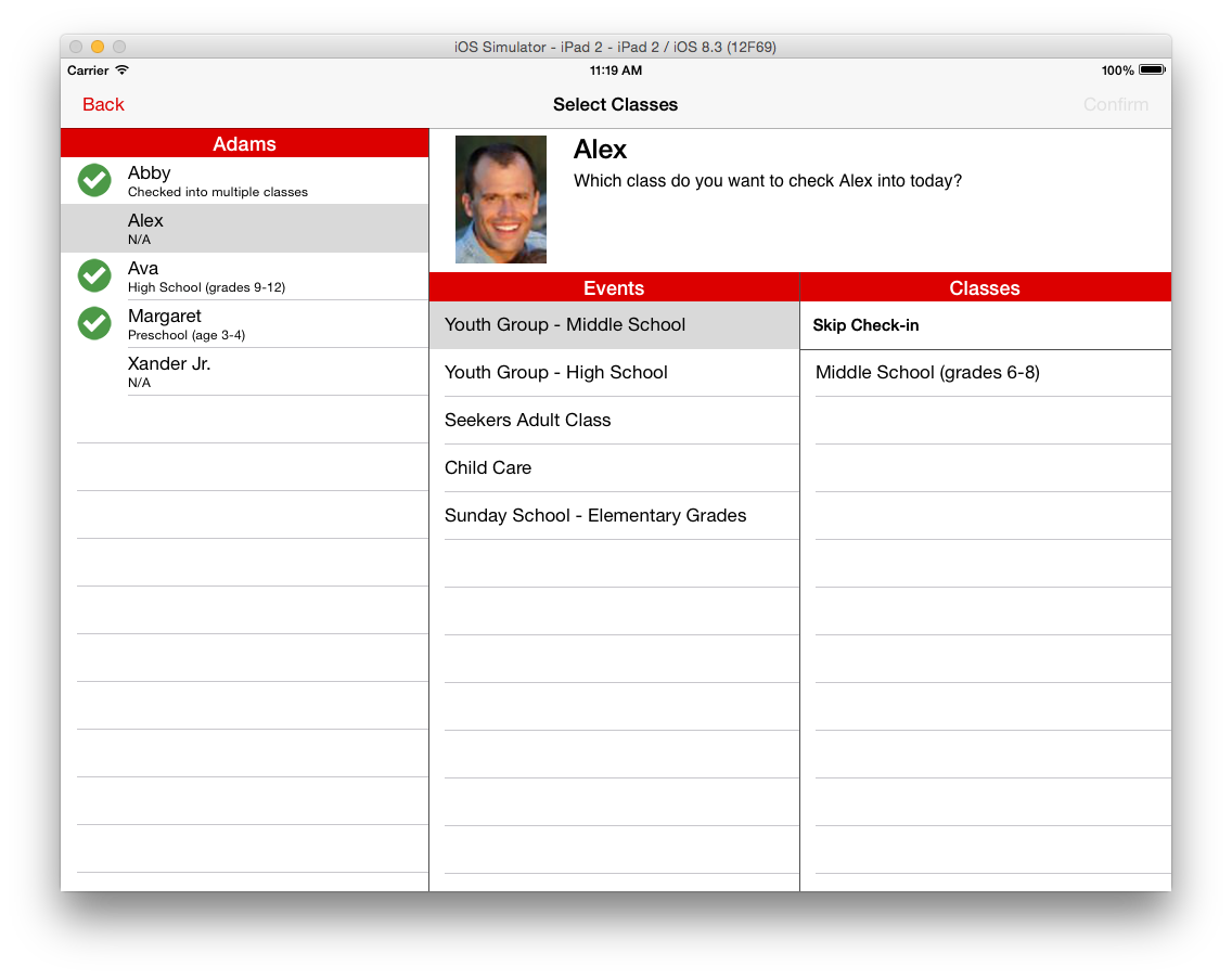 Each family member who is eligible to be checked into the event has a checkmark beside his/her name and the default class CDM+ Mobile will check him/her into. If all appears correct, tap Confirm at the top right of the screen. If someone with a checkmark will NOT be checked in, tap Skip beside his/her name. Then tap Confirm.