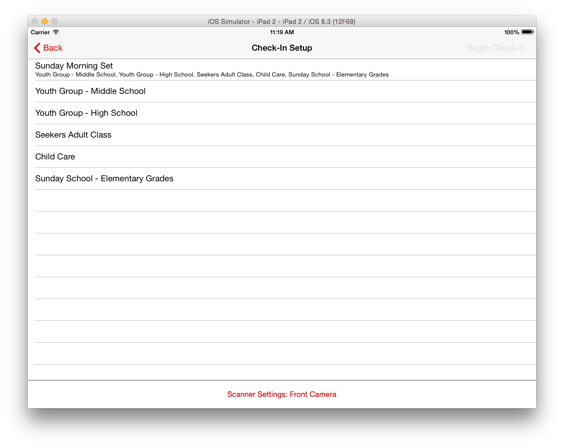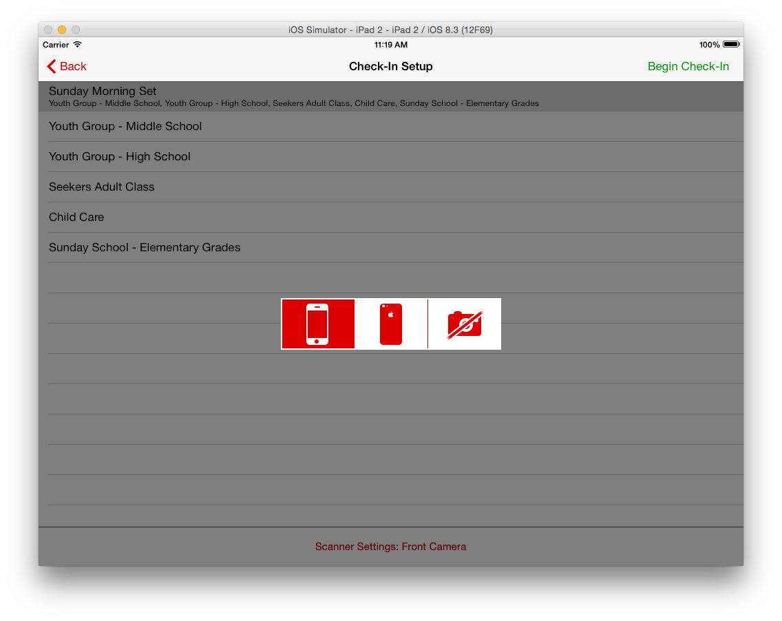 Tap the name of the Event for which you want to run check-in. If this event allows barcode check-in, you can press the settings at the bottom of the setup screen to choose your camera that you want to use. If you do not want to scan, even though the event allows it, select the No Camera option.