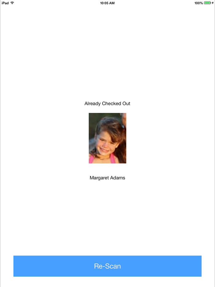 If the Check-In record associated with the Check-In barcode is marked in CDM+ as already checked out, an error will appear telling you so. If you are sure that the individual was NOT checked out, you may tap Re-Scan to scan the barcode again. Under some conditions, you will get this result when the barcode is not scanned correctly. If re-scanning the barcode does not work, you may need to go to the staffed check-in station to confirm the individual's check-in status.