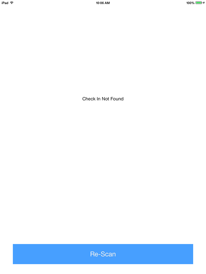 If the Check-In record is not found, an error will appear. In this case, click Re-Scan to try scanning the barcode again. If you get the same result, the Check-In record does not exist.