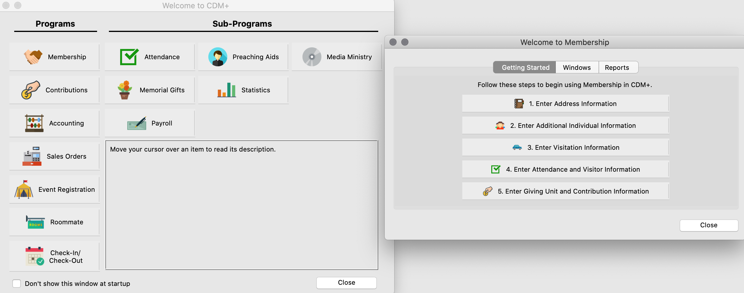 The Getting Started tab is a step-by-step process to help you set up the program for the first time. Use the Windows tab for every-day use.