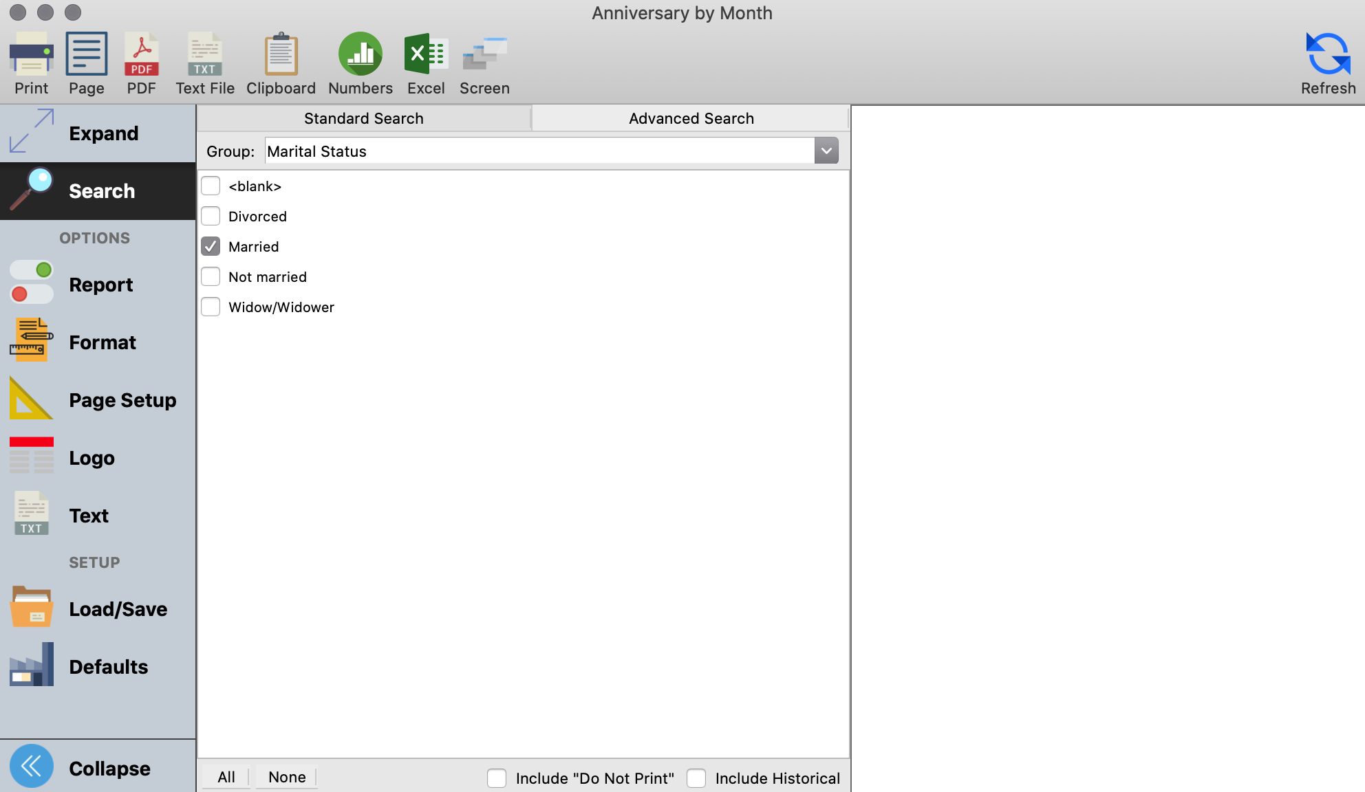 With the Anniversary by Month report, you can print the anniversaries of your church members by month or for a whole year. You can choose the specific group or list that you would like to print and you have the option to page the printout by group.