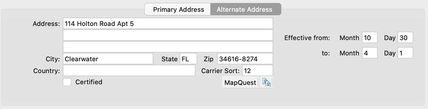 If this family has an alternate address, such as a different winter or summer address or a college address, click on the Alternate Address tab and enter that address and phone number. Enter the effective dates for this address. CDM+ will automatically select the correct address based on these dates when using the “Current” address option on reports.