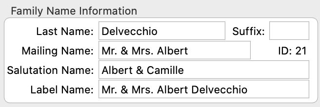 The Mailing Name consists of the first name or names you would use to address mail to a family. Some examples are “Mr. and Mrs. Michael” or “Michael and Susan”.