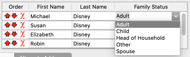 To change the order of individuals in the list, click on the red up and down arrows at the left. This will affect the order in which the individuals are listed on some reports. To delete an individual from the list, click on the red X.