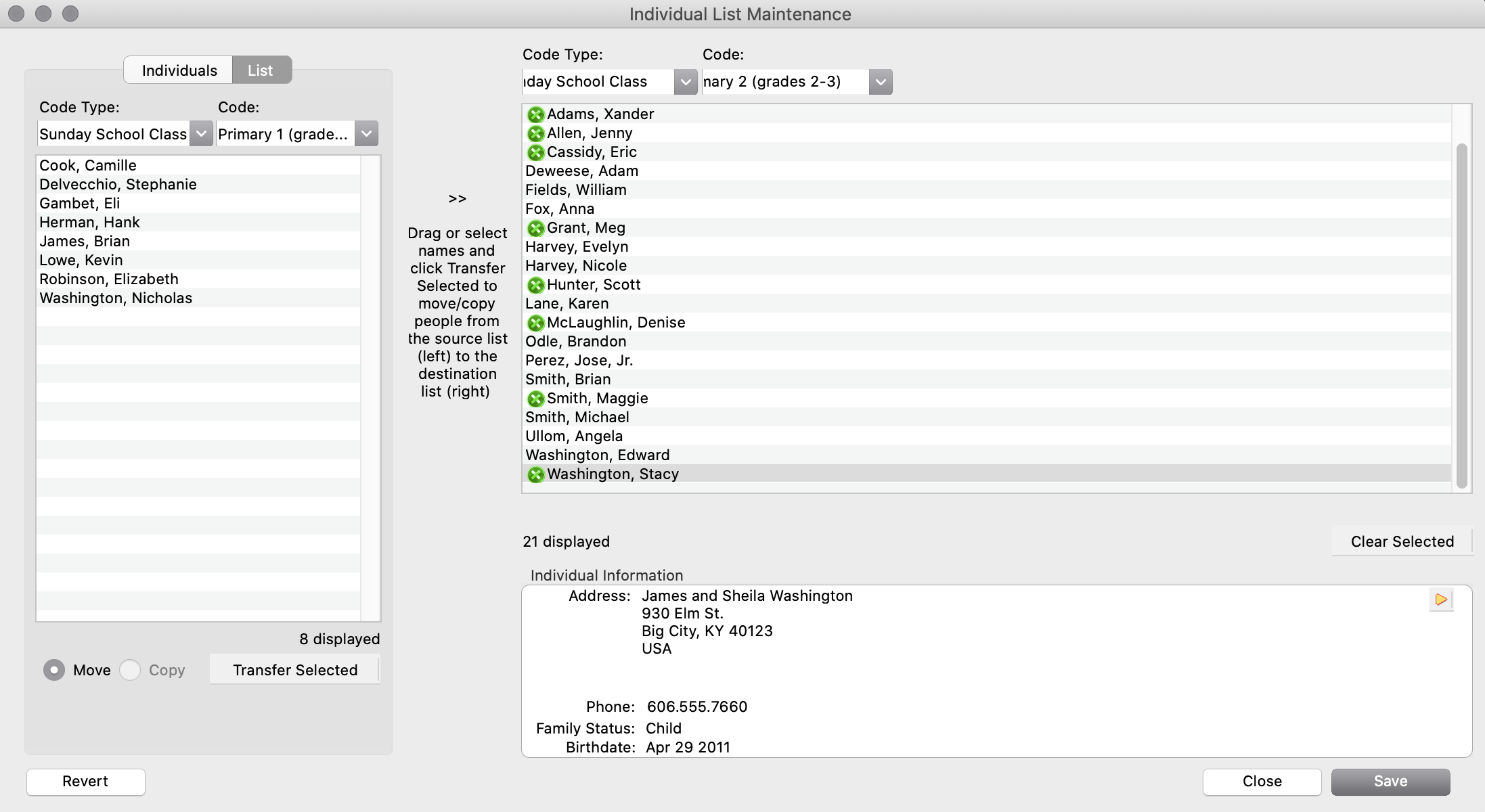 - To move a single individual to the new class, double-click their name on the left-hand side list to transfer it to the list on the right. To move more than one individual shift-click once on each name, and then click Transfer Selected button. A green icon will appear next to the individuals you have moved indicating that the information still needs to be saved.
