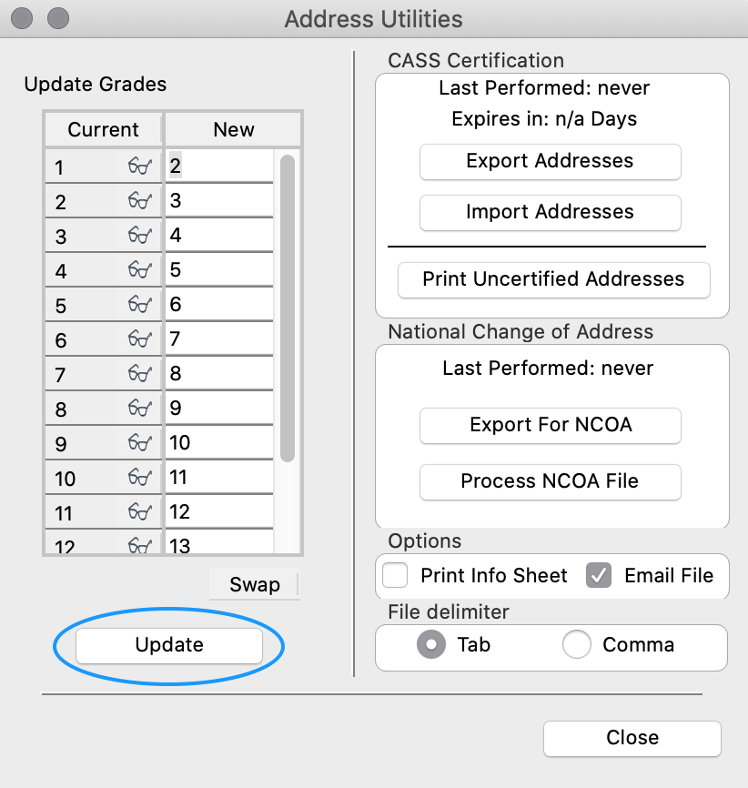 - The Current column shows the students' current grades in Individual Records. The New column shows what their grade will be once the update is complete. Click Update.