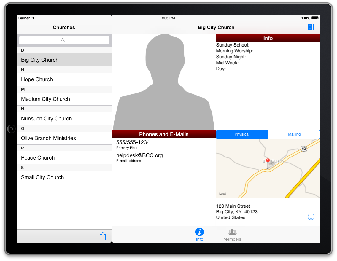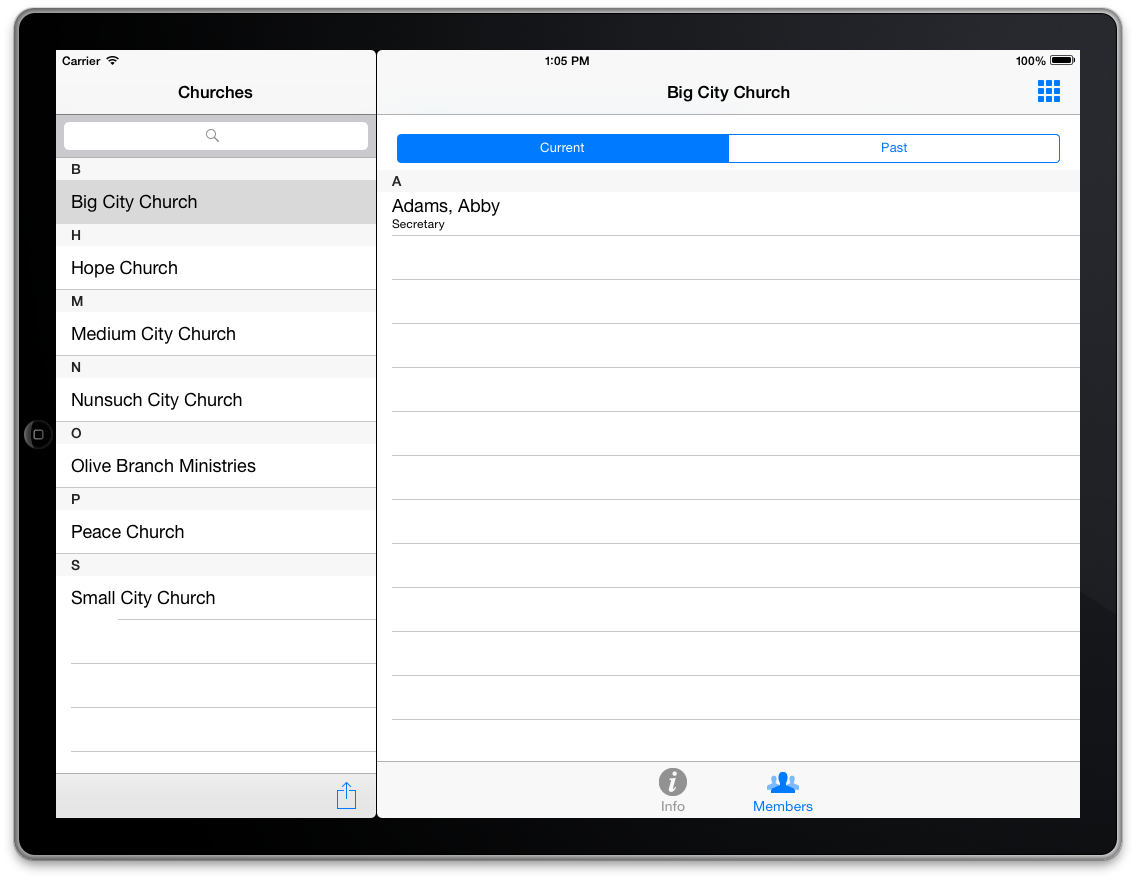 Tap the Members icon at the bottom of the window to view those members that hold/have held positions at the church. To see that individual's information, tap the name.