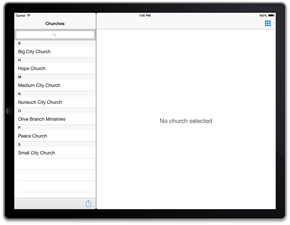 Tap the Churches icon on the Launcher page to open the Churches app.