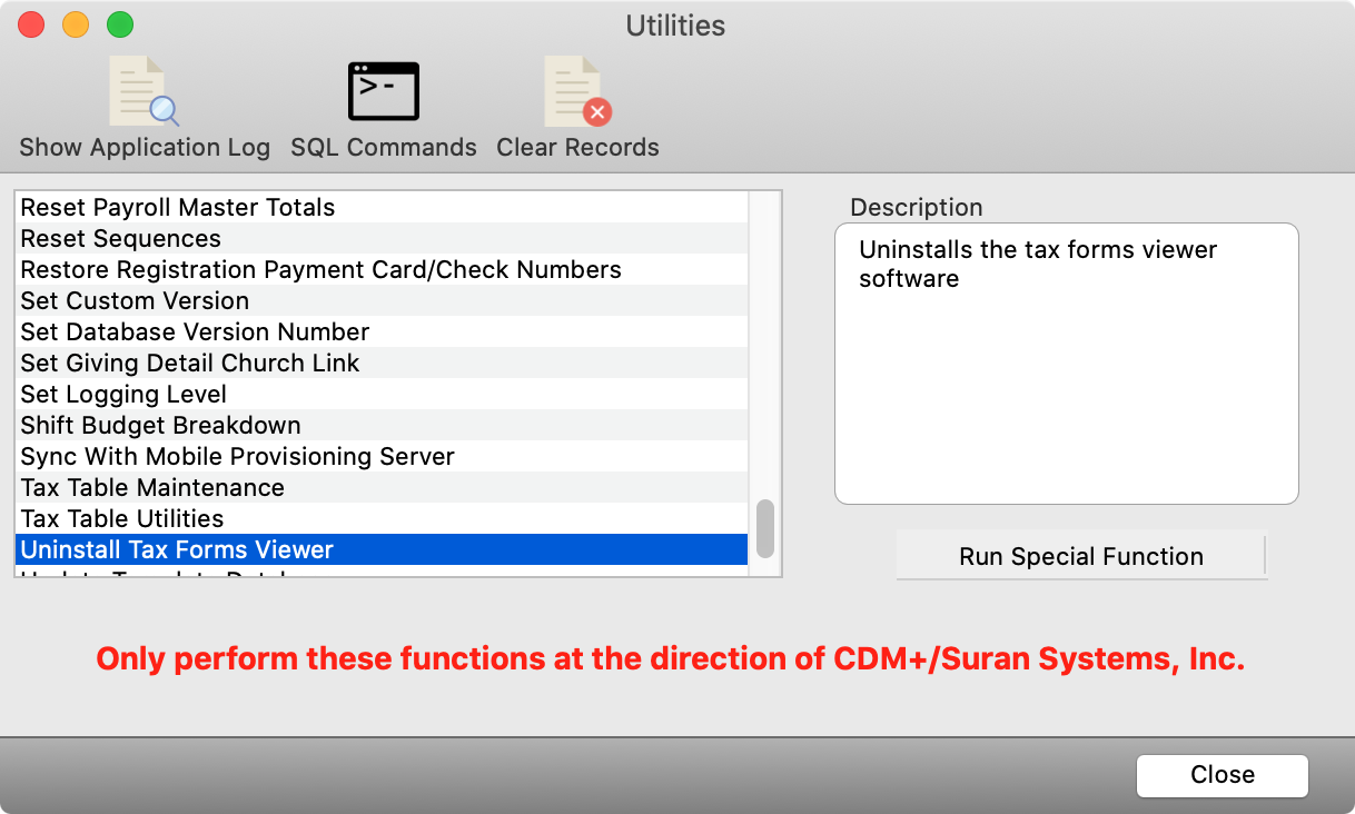 The easiest method to uninstall the tax forms viewer is to open the program and log in as a user who has access to Utilities. Go to File → Utilities and select the Uninstall Tax Forms Viewer Special function. Run that special function and the tax forms viewer will be uninstalled. If you do not have access to Utilities in CDM+, use the manual procedures detailed below that is specific to your platform to uninstall the tax forms viewer.