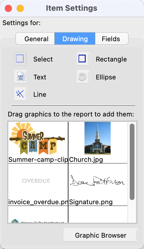 To add a graphic, click on the Graphic Browser button at the bottom of the Item Settings window.