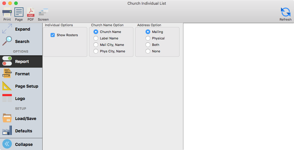 The Church Individual Listing provides a listing of the Individual Records connected to the selected churches. Church leaders, those with a position assignment on their Church tab, are shown at the top of the list. Choosing the Show Rosters option on the Report tab will also display the group assignments for each individual.