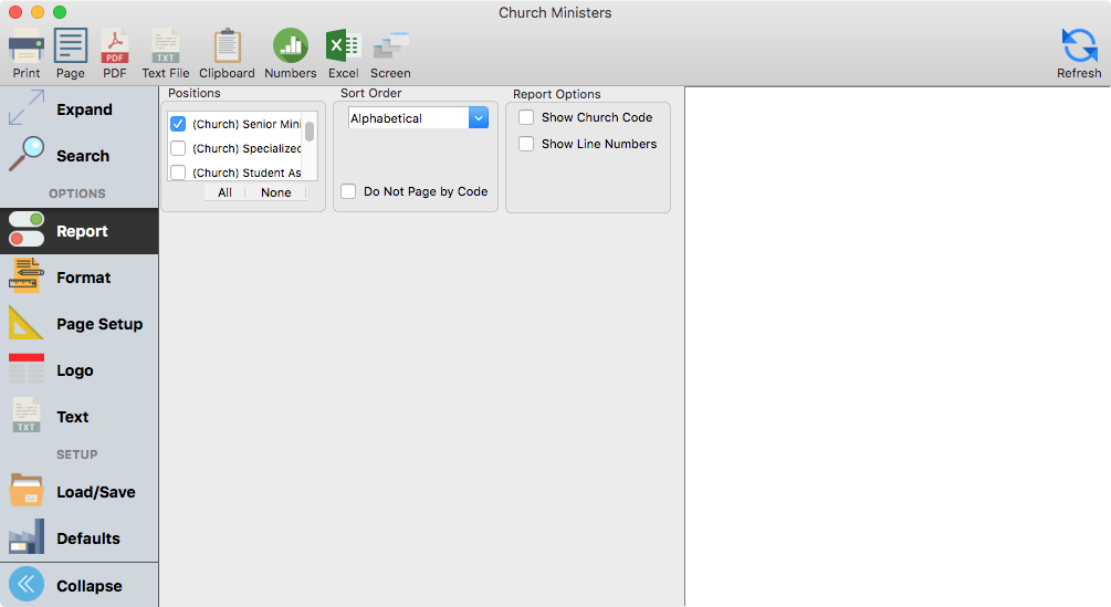 The Church Ministers report provides a directory of churches with ministers and church positions. Choose the positions to be included in the directory from a list of available positions on the Report tab.