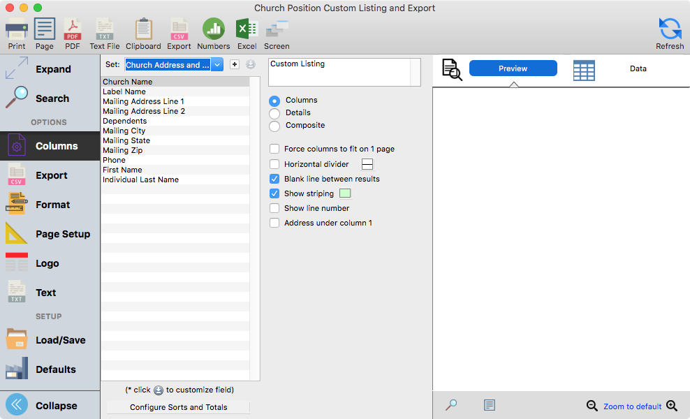 The Church Address Listing provides a listing of the Address Records connected to the selected churches. The listing is formatted to facilitate correction of the address information