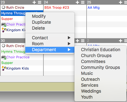 Events on all schedules (Month, Week, Day and Inspector) of the Event Schedule have contextual menus available. Control-click (Macintosh) or right-click (Windows) on an event to access contextual menu. From the contextual menu you can open the Event Information window by selecting Modify, delete the event by selecting Delete, or duplicate the event by selecting Duplicate. The assigned Rooms, Contacts, and Departments for the event will be checked and can be changed by selecting different Rooms, Contacts or Departments. Select a checked item to remove it from the event. Select an un-checked item to assign it to the event.