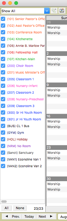 The event schedule will only display events for checked rooms. The All and None buttons allow you to select all rooms or no rooms. To select a range of rooms, click the first in the range, hold down the Shift key, and click the last in the range.