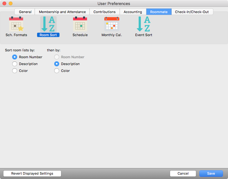 To change the sortation of this list, select User Preferences from the File or CDM+ Roommate menu and click on the CDM+ Roommate tab. Click on the Sorting icon. Use the radio buttons to indicate whether you want to sort the list by Room Number, Description or Color. Click Save. Click Revert to return the settings to the last saved state. You may change these sortation settings at any time by returning to this window.