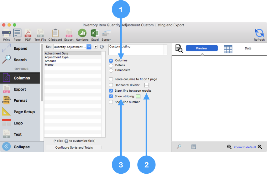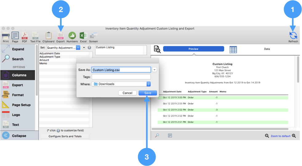 Inventory Item Quantity Adjustment Listing and Export