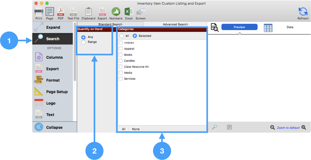 Range - Search a selected range of quantity; e.g. items between 5 and 50 on hand, 1 and 15, etc.