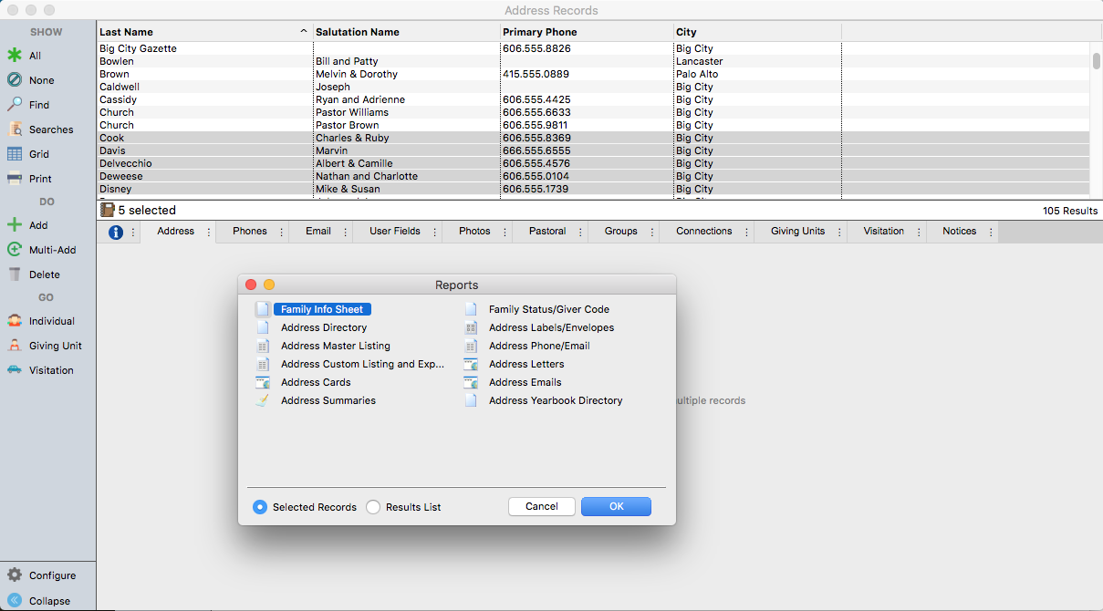 Multiple records may be selected (highlighted) by holding down the Control or Command key while clicking on the desired records.