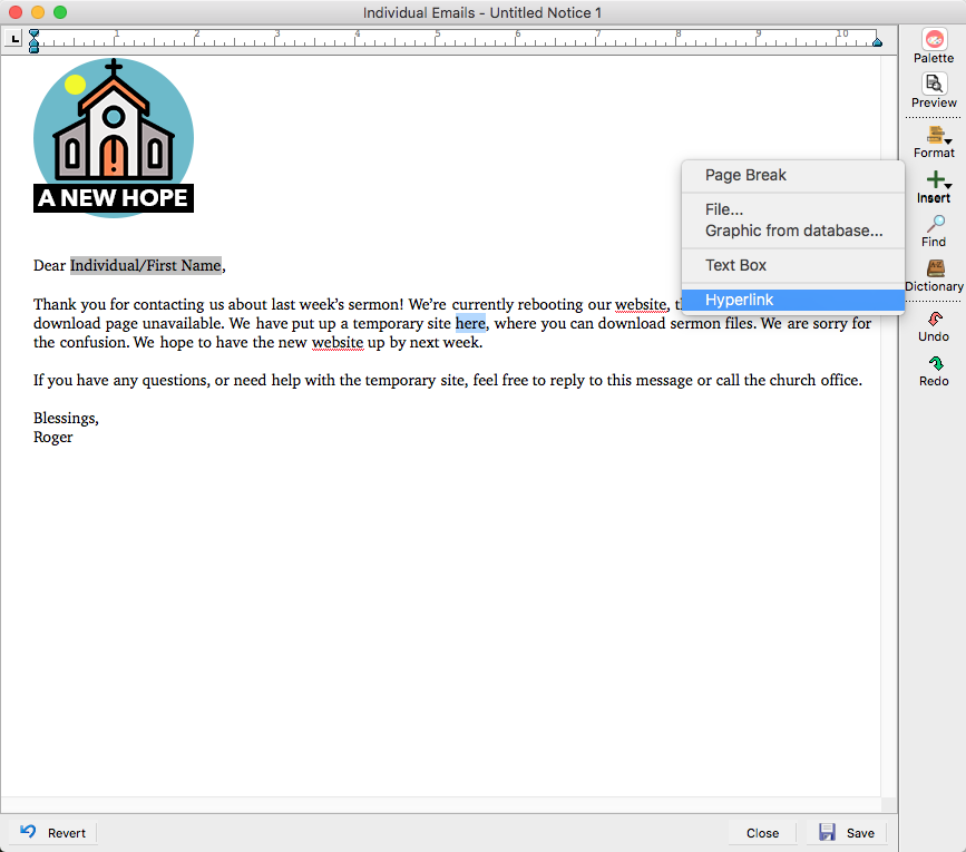 Open your email notice, highlight the word or set of words you wish to attach the hyperlink to, and click on the Insert button on the sidebar. Select Hyperlink.