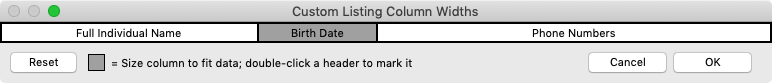 You can customize the widths of the columns by clicking the Widths button in the top bar of the Modify Sets window. CDM+ will open the Column Widths window. To adjust the width of a column, click and drag the divider between the field names. You double-click on a field name to have CDM+ determine the column width based on the data in the column. That column box will turn gray to indicate that this option has been selected.