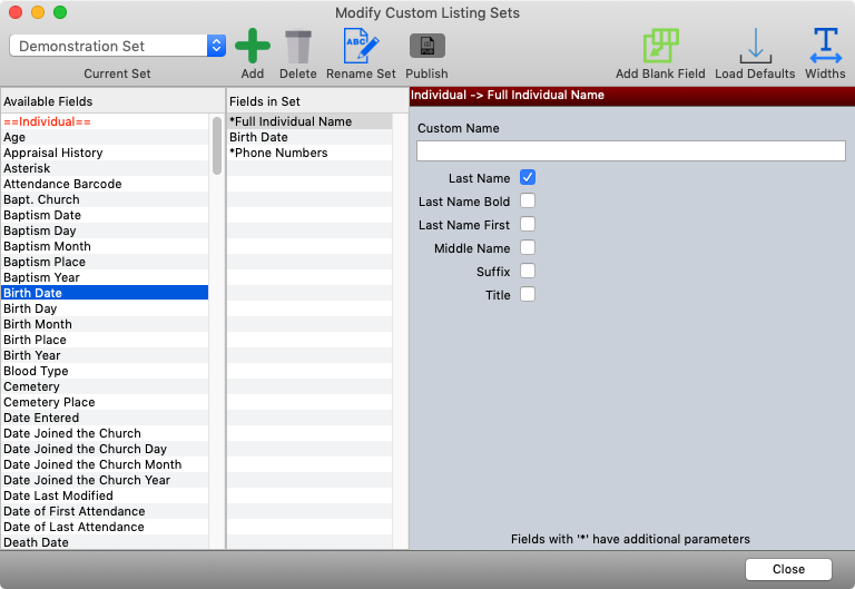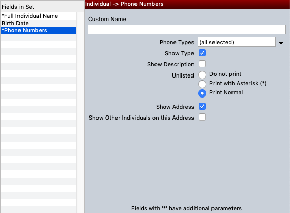 Some fields, when added to the Fields in Set column, have additional parameters that can be used to format the output. These fields are marked with an asterisk (*). For example, when Full Individual Name is added to the Fields in Set list, additional parameters offer formatting options to display the name with the last name first, include the middle name, and include suffixes and titles.