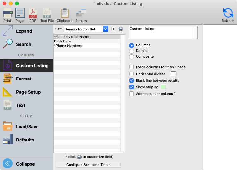 To choose the columns for the custom listing, go to the Custom Listing tab.