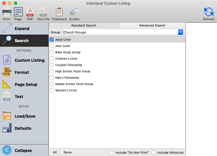 The report setup window will open on the Search tab. Sometimes it is helpful to think of custom listings and exports as spreadsheets with rows and columns of information. Use the Search tab to select the rows or records that you want to include on the listing, for example, members of a particular group.
