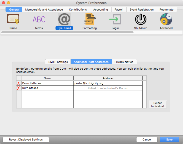 Click on the Additional Staff Address tab of the Preferences window and enter the email addresses of staff members; by default outgoing email notices will be sent to these addresses. You can edit the list at the time you send an email.
