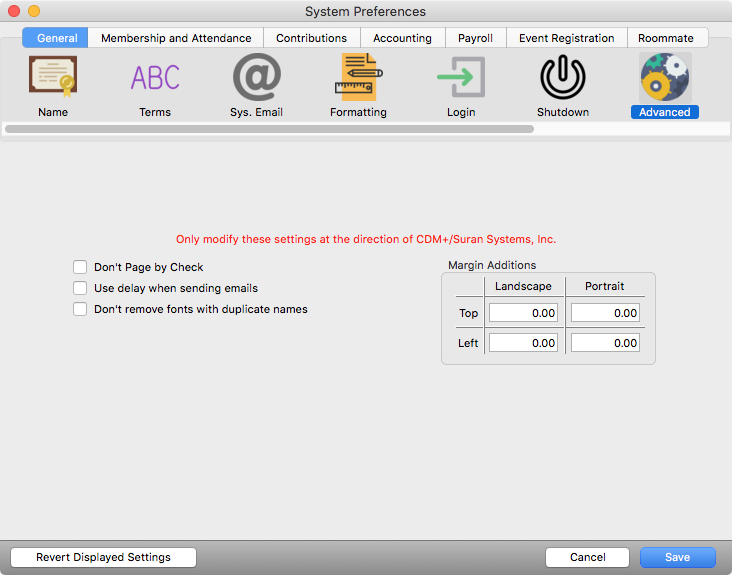 The settings on the Advanced pane of the System General Preferences should be changed ONLY under the direction of a CDM+/Suran Systems, Inc. staff person.